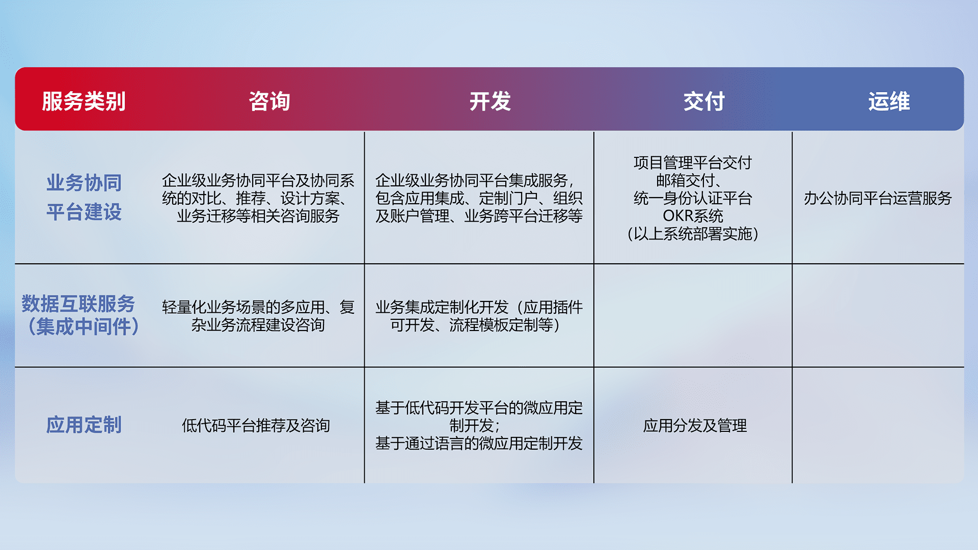 针对钉钉、、、、企微、、、IDaas等平台级产品提供产品的规划、、、方案、、、交付、、定制化开发等服务,,,实现如统一协同办公、、智能客户服务、、混合会议管理、、智能数据查询、、、、等业务场景,,实现数字化转型。。。