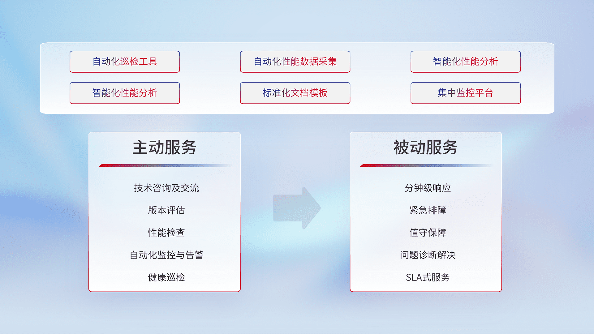 智能化工具和标准化文档,,保障服务质量,,,提供主动服务(包含技术咨询、、、、版本评估、、性能检查、、、自动化监控与告警、、、、健康巡检)和被动服务包含(分钟级响应、、紧急排障、、值守保障、、、、问题诊断解决、、、、SLA服务)。。